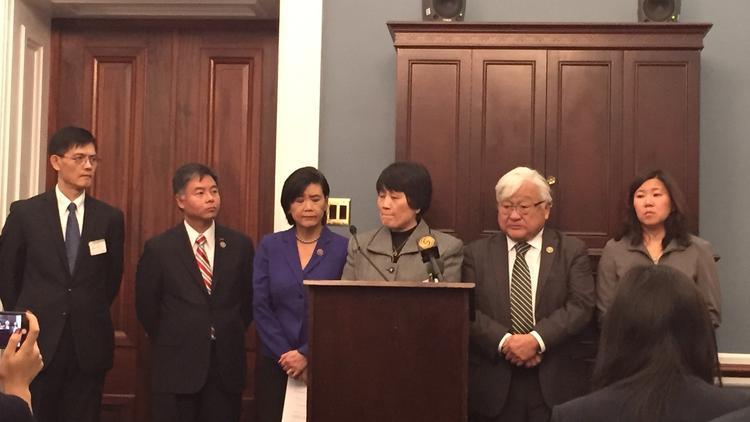 (From left) Temple University physics professor Xi Xiaoxing, Reps. Ted Lieu, Judy Chu, Mike Honda and Grace Meng (D-NY) listen as National Weather Service employee Sherry Chen talks Tuesday about her arrest on espionage charges. The members want the Department of Justice to investigate.(Sarah D. Wire)