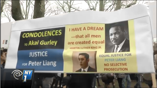 Organizers were clear to tell the crowd that the rally wasn't just a rally for Peter Liang, but for Akai Gurley too, calling him the second victim in this case, and encouraging the crowd to remain peaceful as the court process plays out.(Source: NY1)
