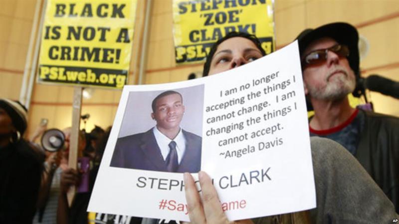 活动人士手举被打死的非洲裔美国人克拉克的照片