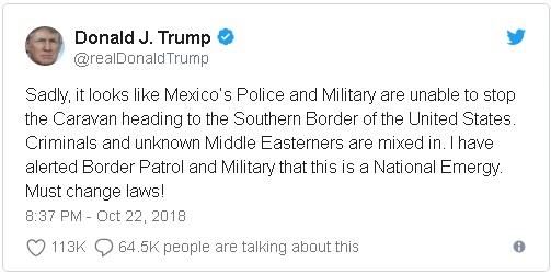 特朗普星期一在推特上发表了这番评论。与此同时,由几千人组成的移民大军继续向美国方向挺进,并于星期日在墨西哥南部城市塔帕丘拉过夜。他们多数来自洪都拉斯。移民们说,国内的暴力和贫穷让他们无法生存。 特朗普在推特上说:“悲哀的是,看来墨西哥的警察和军队无法制止移民大军向美国南部边界行进。罪犯和身份不明的中东人混在其中。我已提醒边境巡逻队和军方这是国家紧急状况。必须修改法律!”