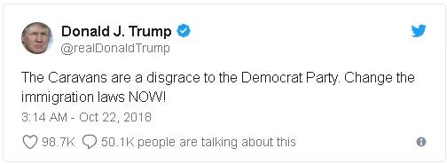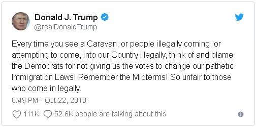 目前离全美范围的国会选举还有两个星期的时间。身为共和党人的美国总统特朗普把最新涌向美国南部边界的移民潮归咎于对立的民主党人。 特朗普说:“每次你看到一支移民大军,或者说非法前来或试图非法进入我们国家的人,就要想到并且责怪民主党人没有给我们足够的票数来修改我们可悲的移民法律!记住中期选举!对那些合法来美的人如此不公!”
