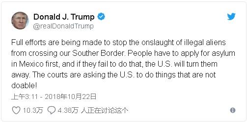 他在星期日发推说,“正在展开全面努力制止非法外国人凶猛地越过我们的南部边界。人们必须先在墨西哥申请庇护,如果他们没能这样做,美国会让他们回去。法庭正在要求美国做不可能做到的事情!” 特朗普说,美国现行的移民法律和边境政策没有强有力地保护美国,而这要怪民主党人。 “移民大军是民主党的耻辱。修改移民法。现在就做!”他发推说。