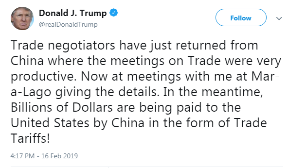 川普周日继续与贸易官员们进行会议,他说,“在很多不同的领域都取得了很大的进展!我们国家在未来和更高层面的发展上有如此巨大的潜力!” 美国和中国都报道了上周为期五天的北京谈判所取得的进展,但白宫表示,仍有许多工作要做,以迫使中国的贸易行为发生变化。 川普上周五在白宫举行的新闻发布会上表示,与中国的谈判“非常复杂”,他可能延长3月1日的最后期限,防止对中国商品的关税继续上升。 如果在3月1日未能达成协议,解决美国要求中国限制强制技术转让和更好地执行知识产权的问题,美国对价值2000亿美元的中国进口产品的关税将从10%增加到25%。 下一轮会谈即将登场,双方同意努力达成“谅解备忘录”,这可能成为川普与习近平达成协议的基础,尽管两国领导人之间的会面尚未安排。 川普的乐观言论与白宫官方声明中的慎重语气形成鲜明对比。 在声明中,声明称“仍有许多工作要做”,并未提及中国声明中的“原则性共识”。